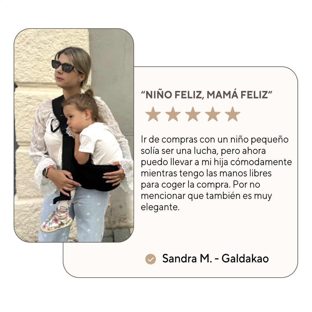 "Mi hijo pequeño ejercía mucha presión sobre mi espalda, pero este portabebés realmente la reparte de forma equilibrada. Me salvó del dolor de espalda y por fin puedo disfrutar del día sin molestias."